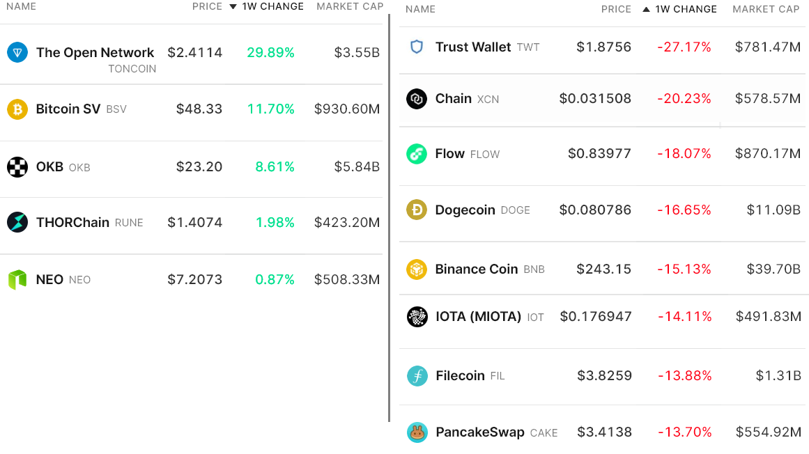 Mức giảm 4,7% hàng tuần trong tổng vốn hóa thị trường bị ảnh hưởng chủ yếu bởi giá Ether (ETH) giảm 5,4% và BNB được giao dịch giảm 15,1%. Do đó, tâm lý giảm giá đã ảnh hưởng đáng kể đến các altcoin, với 14 trong số 80 đồng tiền hàng đầu giảm 12% trở lên trong giai đoạn này.