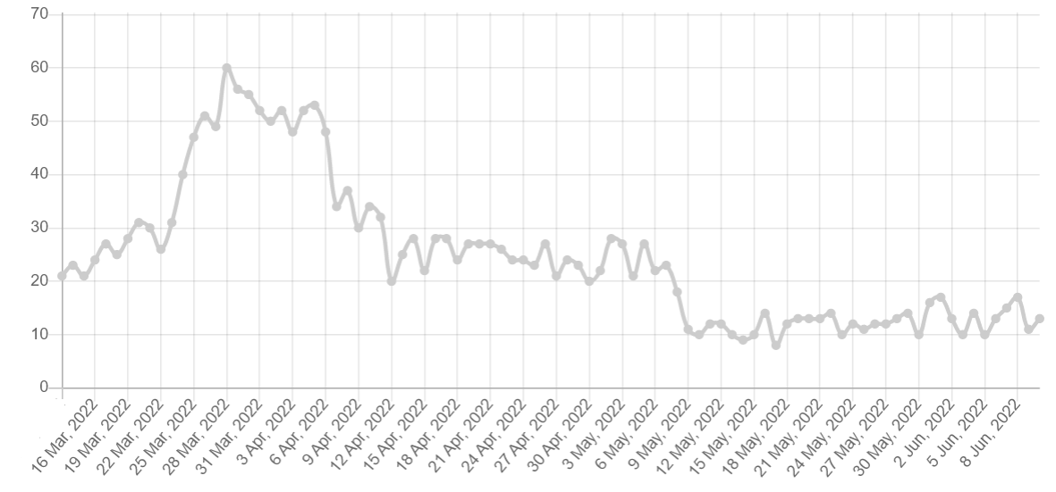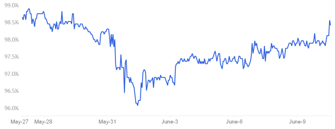 Vào ngày 31 tháng 5, giá Tether trên các thị trường ngang hàng châu Á giảm 4%, báo hiệu áp lực bán lẻ mạnh mẽ. Thật kỳ lạ, tình hình đã được cải thiện vào ngày 10 tháng 6 sau khi chỉ báo chuyển sang mức chiết khấu 1,5%. Mặc dù vẫn ở mức tiêu cực, số liệu này cho thấy sự sẵn sàng mua của các nhà đầu tư khi tổng vốn hóa tiền điện tử giảm xuống dưới 1,2 nghìn tỷ USD.