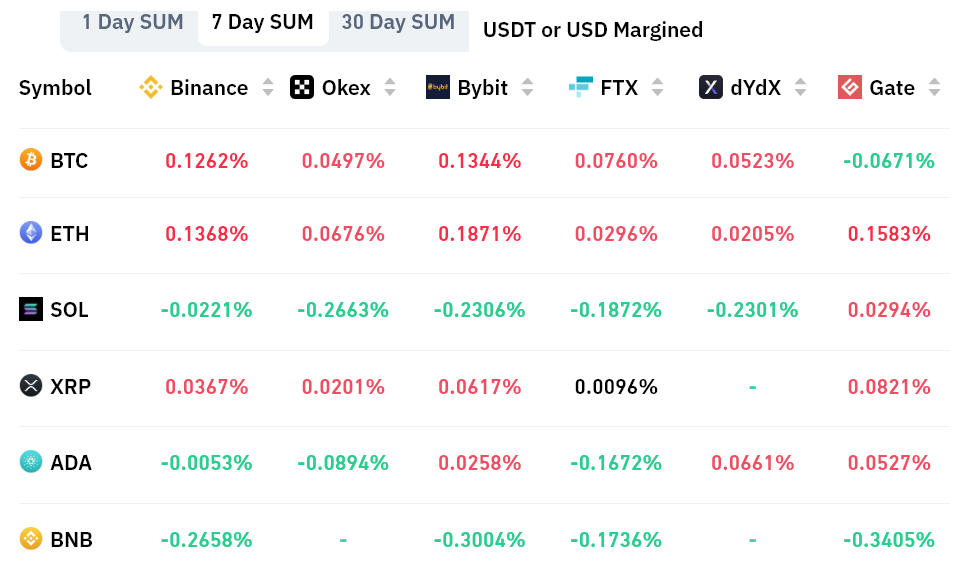 Các hợp đồng vĩnh viễn phản ánh tâm lý trái chiều sau khi Bitcoin và Ethereum giữ tỷ lệ tài trợ hơi tích cực (tăng), nhưng tỷ giá altcoin là tiêu cực. Ví dụ: tỷ lệ âm 0,20% hàng tuần của BNB tương đương 0,8% mỗi tháng, thường không phải là mối quan tâm đối với các trader phái sinh.