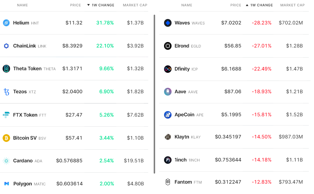Dưới đây là những người chiến thắng và kẻ thua cuộc trong bảy ngày qua. Trong khi hai loại tiền điện tử hàng đầu cho thấy mức lỗ khiêm tốn, một số ít các altcoin có mức vốn hóa trung bình đã giảm từ 14% trở lên.