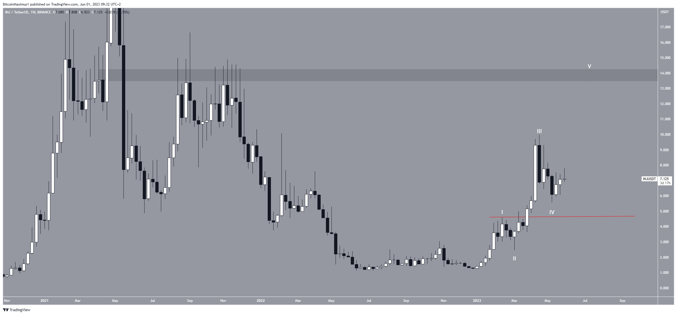 Giá INJ sẽ hoàn thành sóng thứ năm gần vùng kháng cự ngang 14 USD nếu số đếm là chính xác. Mặc dù mức này thấp hơn đáng kể so với mức cao nhất mọi thời đại của nó, nhưng đây là ngưỡng kháng cự cuối cùng trước đó.