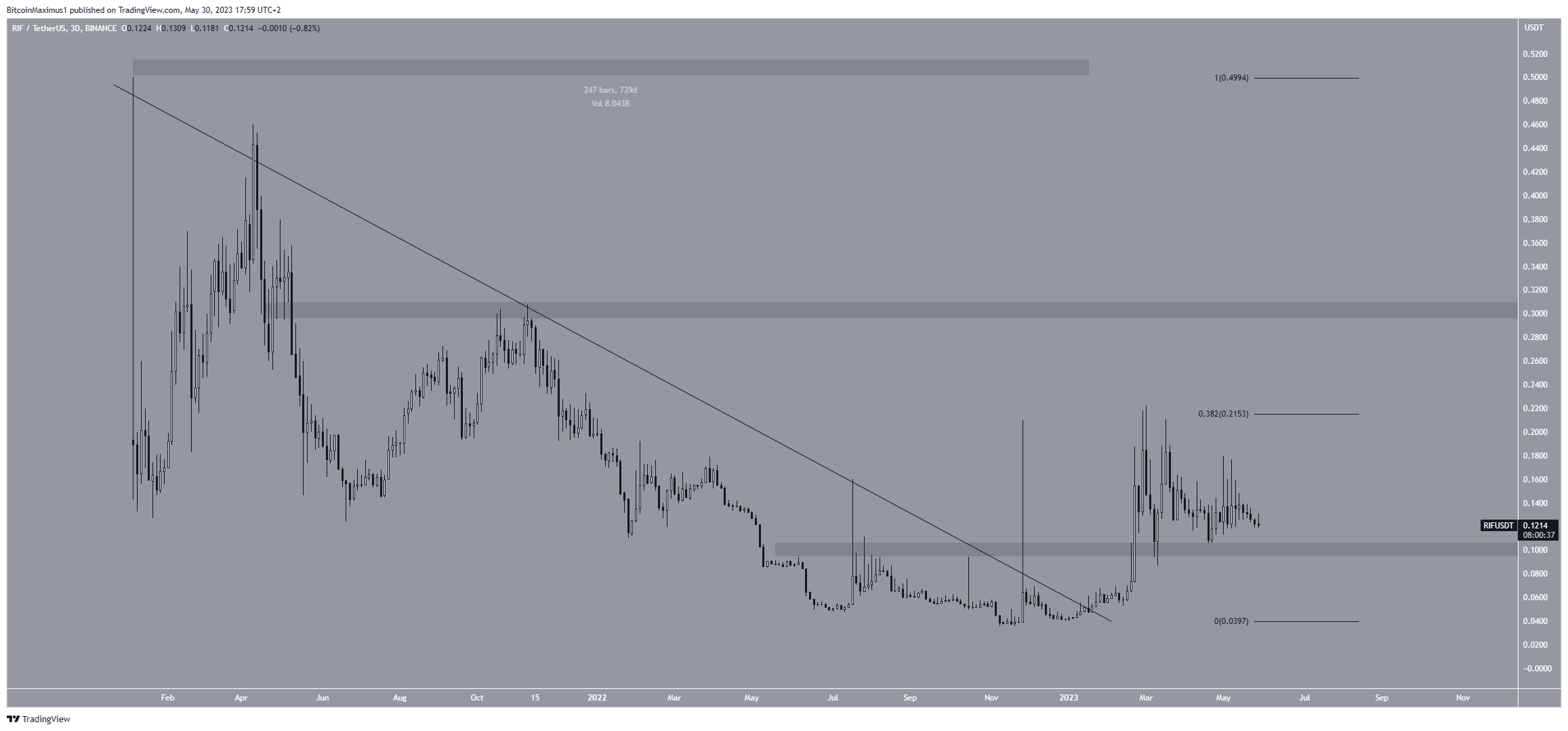 Đây là trường hợp của RIF, đạt mức cao mới hàng năm là 0,22 USD vào tháng 3 năm 2023. Tuy nhiên, giá đã giảm kể từ khi được xúc tác bởi sự từ chối từ mức kháng cự Fib thoái lui 0,382.