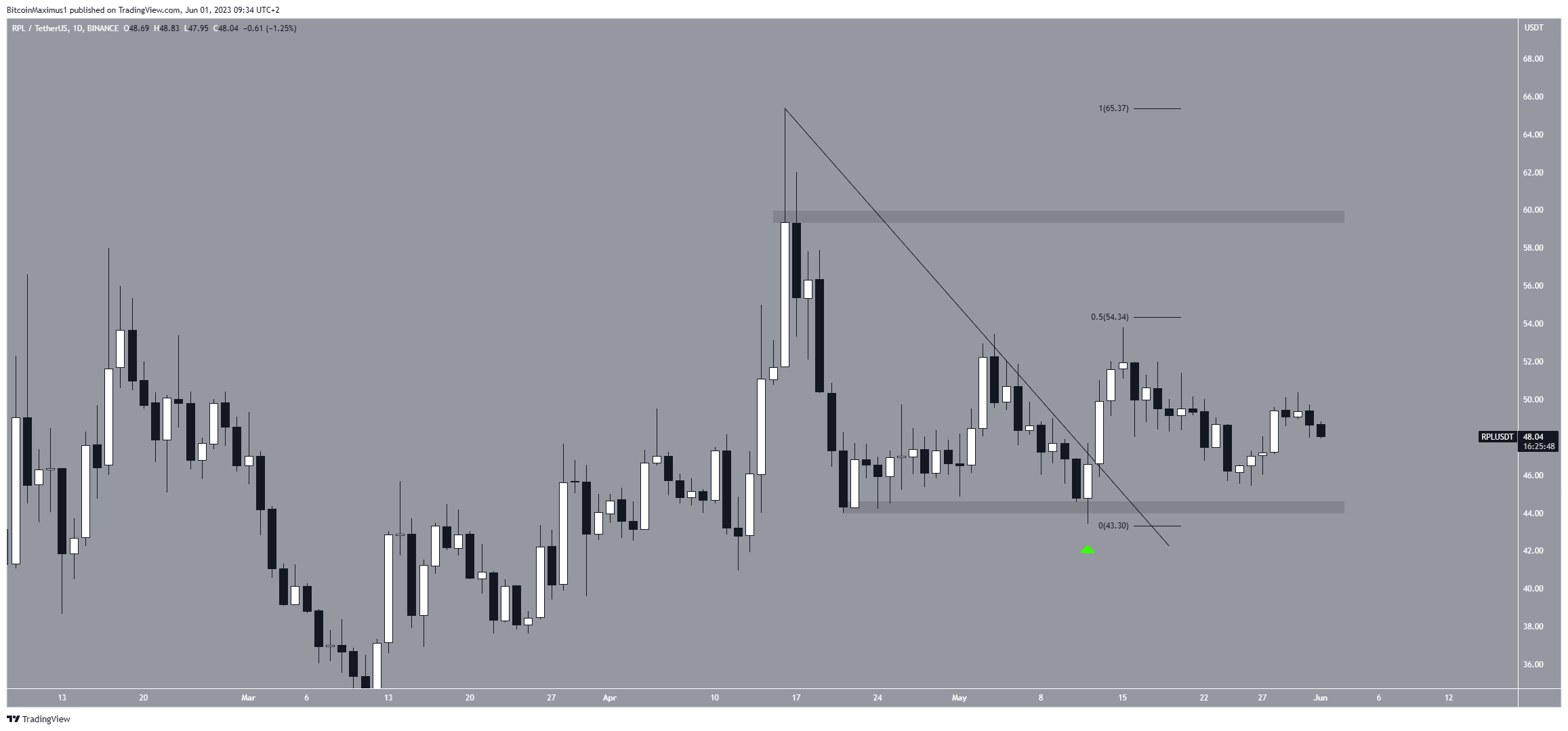Nếu giá RPL vượt qua mức kháng cự Fib thoái lui 0,5 là 54,30 USD, thì nó có khả năng chuyển sang mức cao mới mọi thời đại.