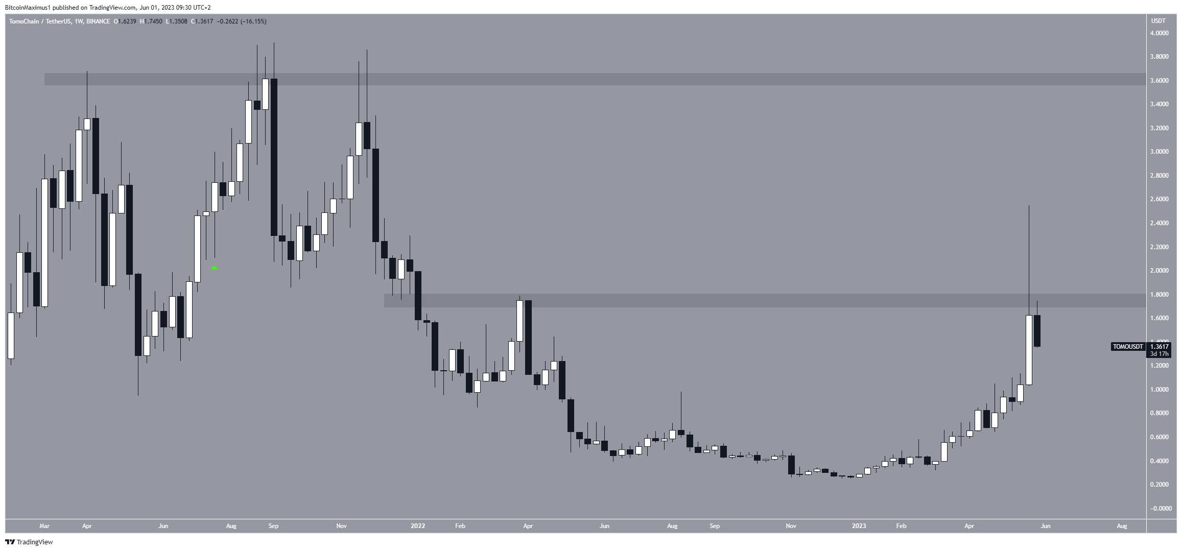 Hơn nữa, bấc đã khiến giá TOMO giảm xuống dưới vùng nằm ngang 1,70 USD, được cho là sẽ cung cấp mức kháng cự. Mặc dù độ lệch trên khu vực là một dấu hiệu giảm giá quyết định, nhưng không còn mức kháng cự nào cho đến mức cao nhất mọi thời đại gần 3,60 USD.