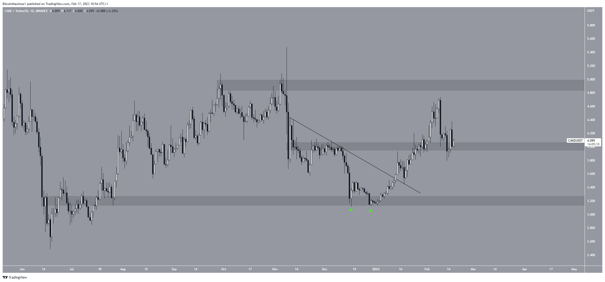 Giá CAKE đã thoát ra khỏi đường kháng cự giảm dần vào ngày 18 tháng 1. Nó đạt mức cao nhất là 4,74 USD vào ngày 9 tháng 2. Trong khi giảm sau đó, nó đã xác nhận mức 4 USD là mức hỗ trợ. Nếu mức tăng tiếp tục, giá CAKE có thể tăng lên 4,90 USD. Tuy nhiên, nếu giá của PancaSwap giảm xuống dưới 4 USD, thì có thể giảm xuống còn 3,20 USD.