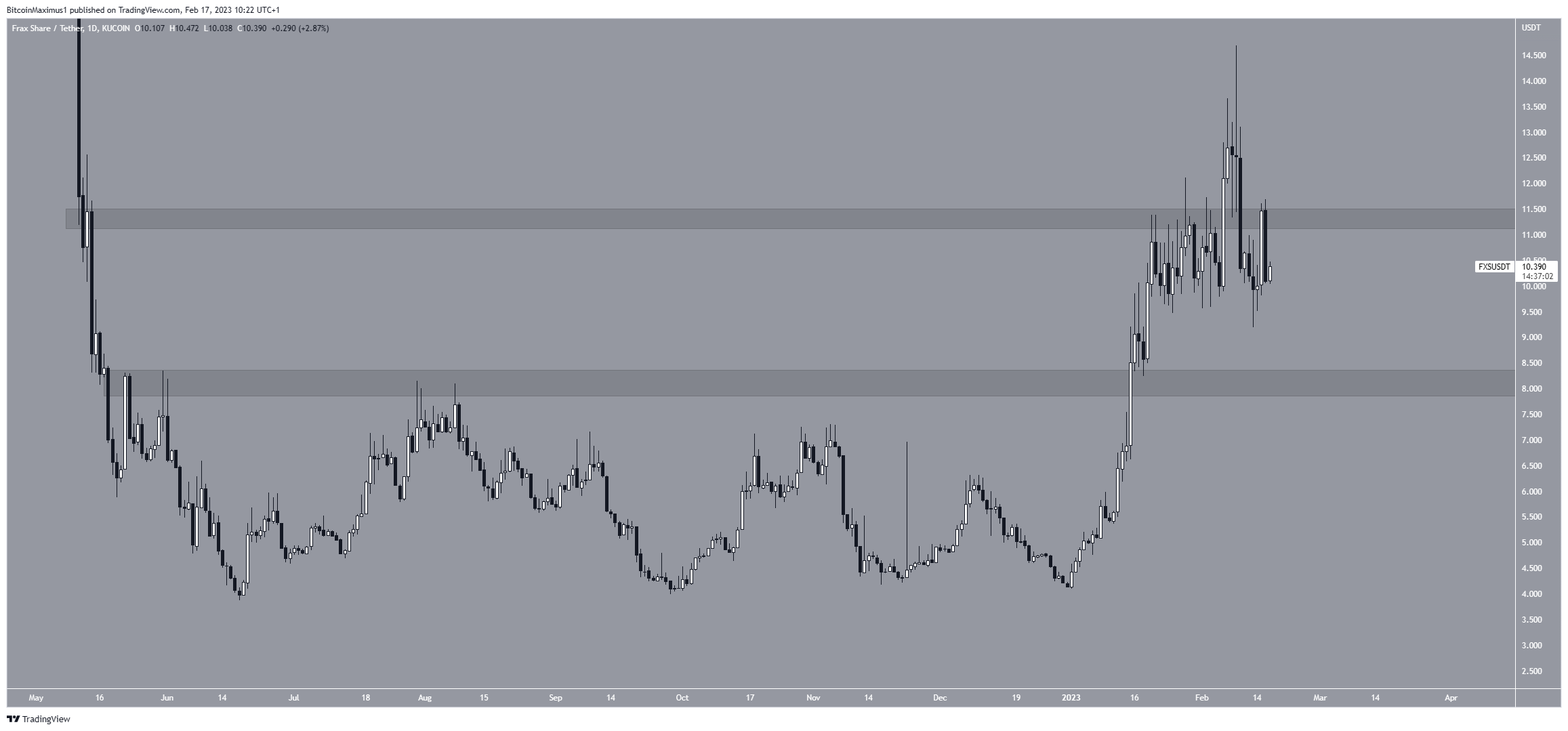 Nếu tiếp tục giảm, vùng hỗ trợ gần nhất sẽ là 8 USD. Mặt khác, nếu giá của Frax Share lấy lại vùng kháng cự 11,40 USD, nó có thể tiến tới mức cao nhất mọi thời đại mới ở mức 15 USD, bắt kịp phần còn lại của thị trường tiền điện tử.