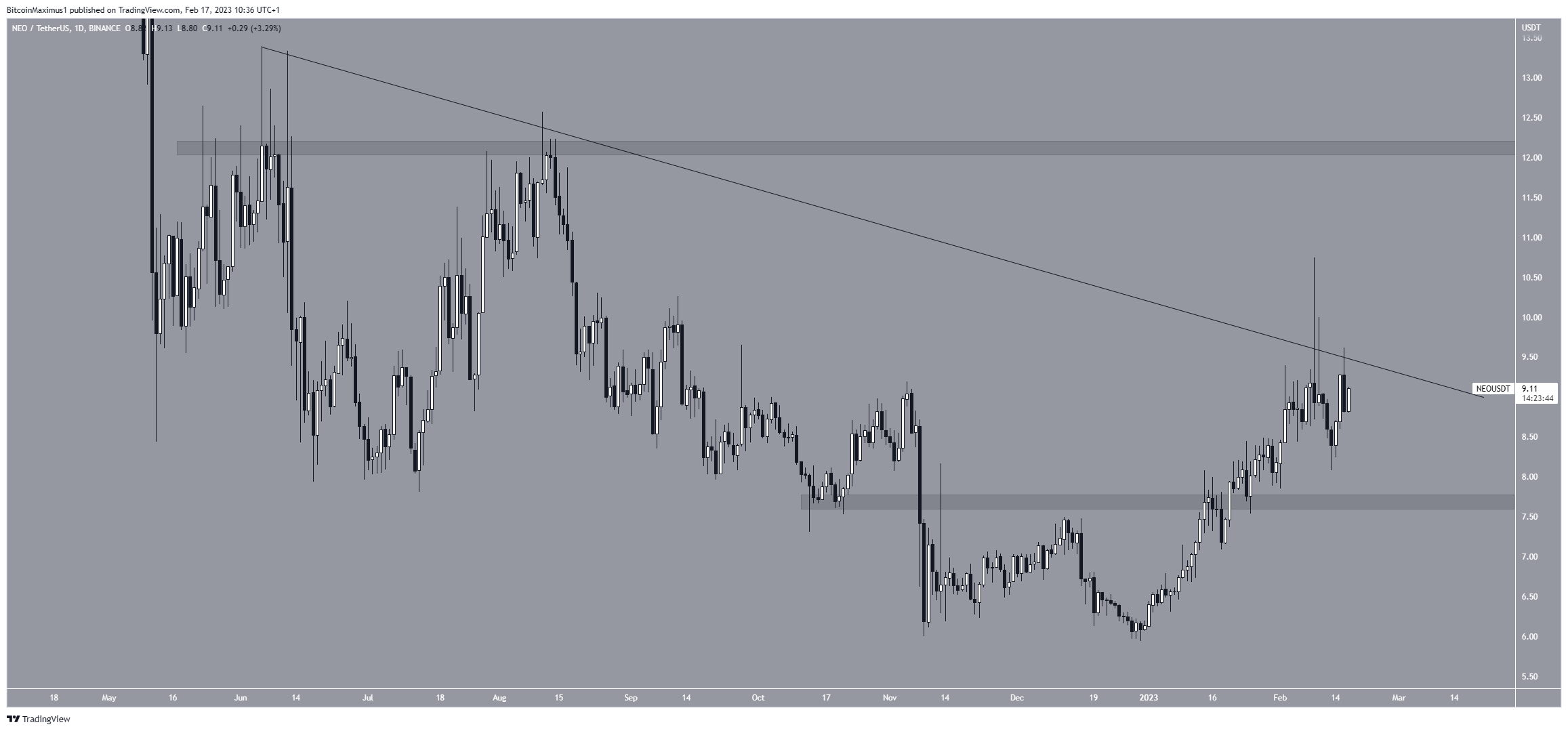 Giá NEO đã giảm xuống dưới đường kháng cự giảm dần kể từ tháng 6 năm 2022. Gần đây hơn, đường này đã gây ra sự từ chối vào ngày 13 tháng 2 (biểu tượng màu đỏ), tạo ra một bấc trên rất dài.