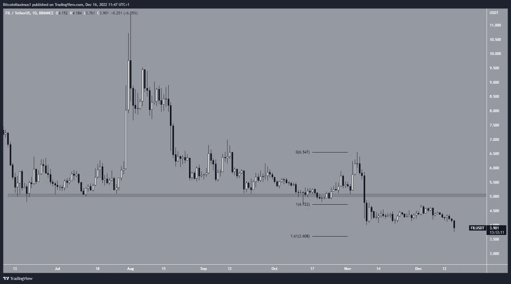 Phong trào đi xuống đã được tiếp tục kể từ đó. Vào ngày 16 tháng 12, FIL đạt mức thấp nhất là 3,76 USD. Xu hướng được coi là giảm cho đến khi FIL lấy lại khu vực 5 USD.