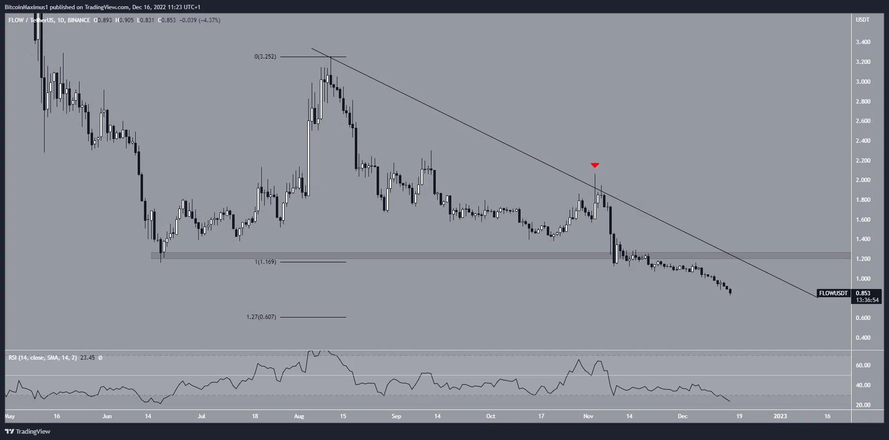 FLOW là token tiện ích cho blockchain Flow. Giá FLOW đã giảm bên dưới đường kháng cự giảm dần kể từ đầu tháng 8. Đường này đã gây ra sự từ chối vào tháng 11 (biểu tượng màu đỏ), đẩy nhanh tốc độ giảm và gây ra sự cố xuống dưới 1,22 USD.