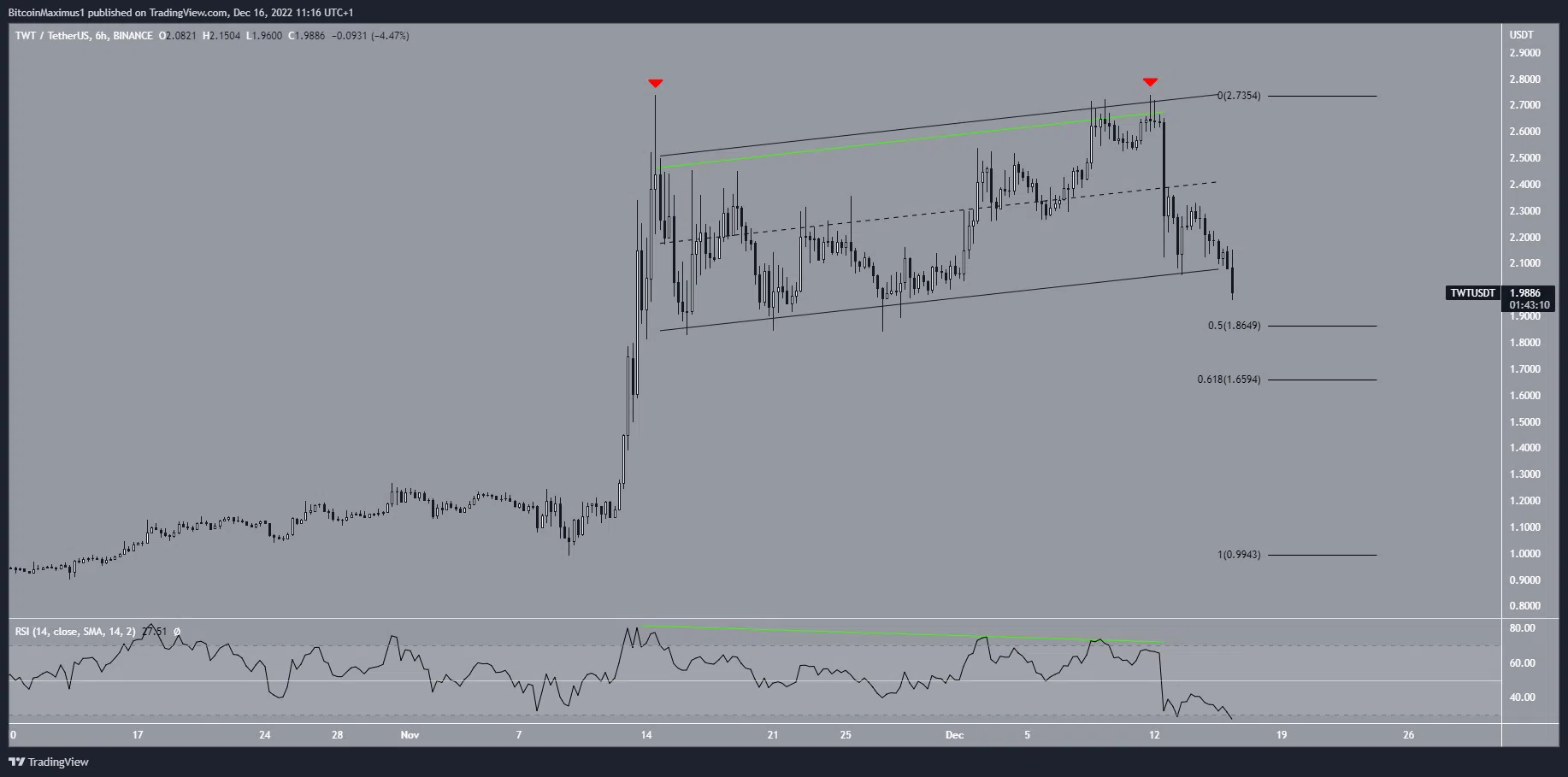 Tuy nhiên, giá TWT đã tạo đỉnh kép vào ngày 14 tháng 11 và ngày 14 tháng 12 (biểu tượng màu đỏ). Mô hình đỉnh kép được coi là một mô hình giảm giá, có nghĩa là hầu hết thời gian nó dẫn đến sự cố. Vào ngày 16 tháng 12, altcoin đã phá vỡ kênh song song tăng dần, xác nhận mô hình giảm giá.