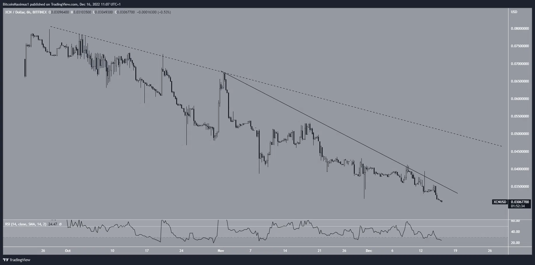 Giá XCN đã giảm xuống bên dưới đường kháng cự giảm dần (nét đứt) kể từ ngày 27 tháng 9. Chuyển động đi xuống tăng tốc vào ngày 1 tháng 11, tạo ra một đường kháng cự giảm dần thậm chí còn dốc hơn (nét liền). Điều này dẫn đến mức giá thấp nhất mọi thời đại mới là 0,03 USD vào ngày 16 tháng 12.