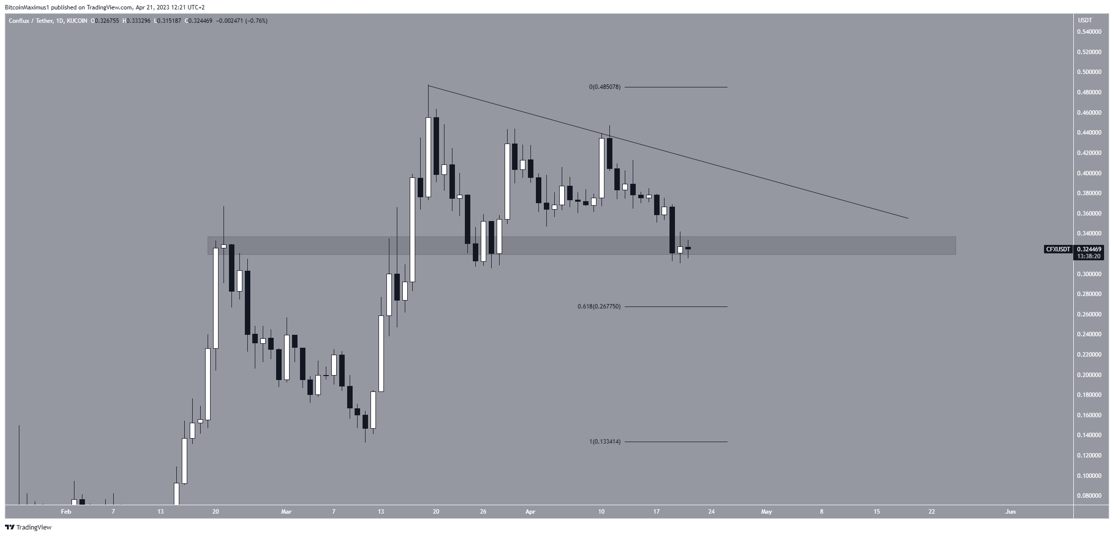 Giá CFX đã giảm xuống dưới đường kháng cự giảm dần kể từ ngày 19 tháng 3. Những đường như vậy cho thấy xu hướng đang giảm và đo lường độ dốc của xu hướng giảm. Hiện tại, giá CFX đang giao dịch bên trong vùng hỗ trợ ngang 0,32 USD.