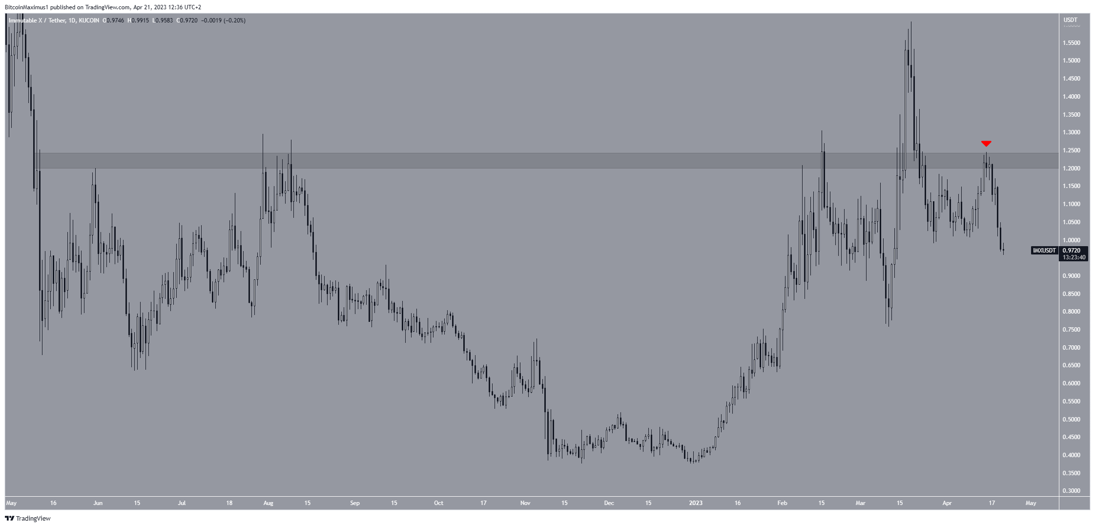 Giá IMX đã giảm kể từ ngày 19 tháng 3. Vào ngày 29 tháng 3, nó đã giảm xuống dưới mức kháng cự 1,20 USD và được xác nhận là mức kháng cự vào ngày 15 tháng 4 (biểu tượng màu đỏ). Đây được coi là một dấu hiệu của sự suy yếu thường dẫn đến giá giảm.