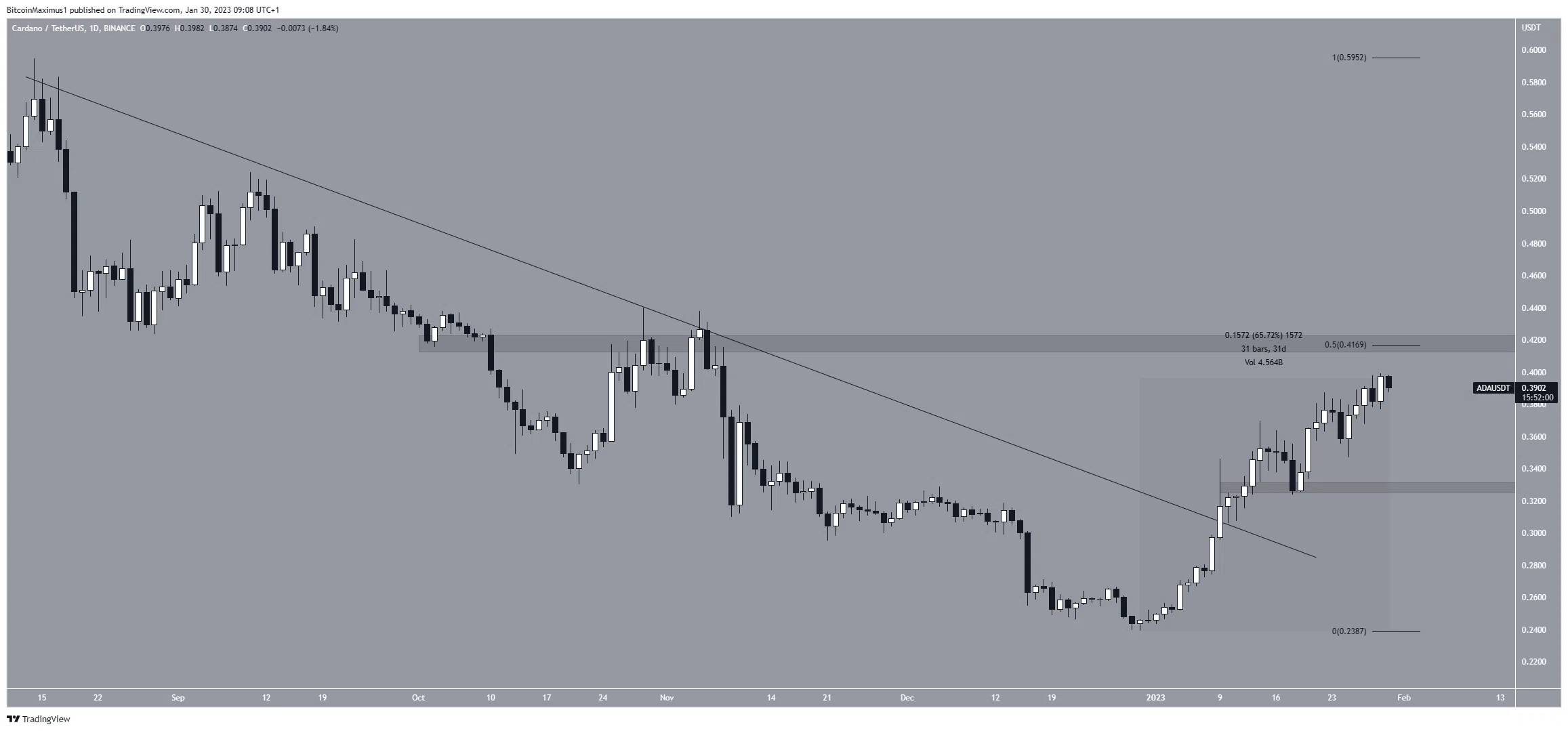 Giá Cardano đã tăng 66% kể từ đầu năm. Nó đã thoát ra khỏi một đường kháng cự giảm dần dài hạn vào ngày 9 tháng 1. Giá hiện đang ở rất gần với vùng kháng cự 0,42 USD. Việc nó phá vỡ hay bị từ chối có thể xác định hướng của xu hướng.