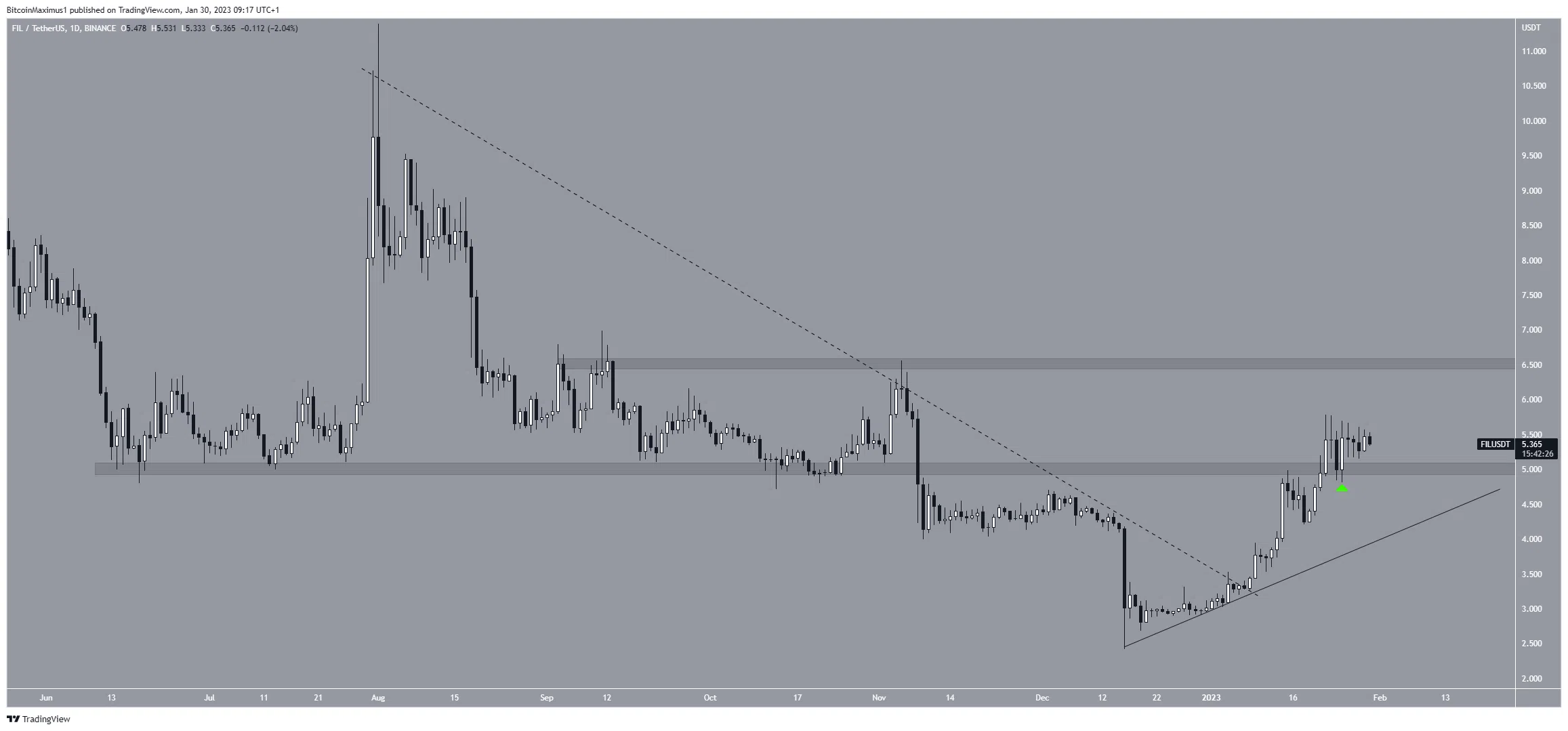Giống như giá Cardano, giá FIL cũng đã thoát ra khỏi đường kháng cự giảm dần vào ngày 8 tháng 1. Sau đó, nó đã lấy lại vùng kháng cự 5 USD và xác nhận nó là hỗ trợ vào ngày 25 tháng 1 (biểu tượng màu xanh lá cây). Xu hướng vẫn tăng miễn là altcoin không đóng cửa dưới mức kháng cự 5 USD. Trong trường hợp đó, mức kháng cự tiếp theo sẽ là 6,50 USD.