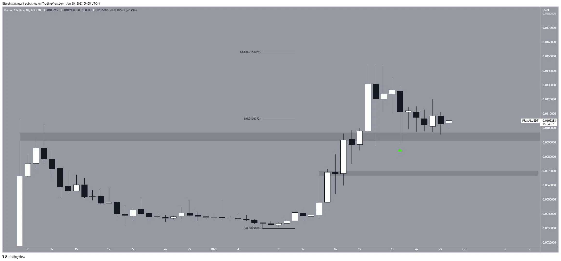Giá PRIMAL đạt mức cao nhất mọi thời đại là 0,014 USD vào ngày 20 tháng 1. Sau đó, nó quay trở lại và xác nhận khu vực nằm ngang 0,009 USD làm hỗ trợ năm ngày sau đó. Điều này tạo ra một sợi bấc dài phía dưới (biểu tượng màu xanh lá cây).