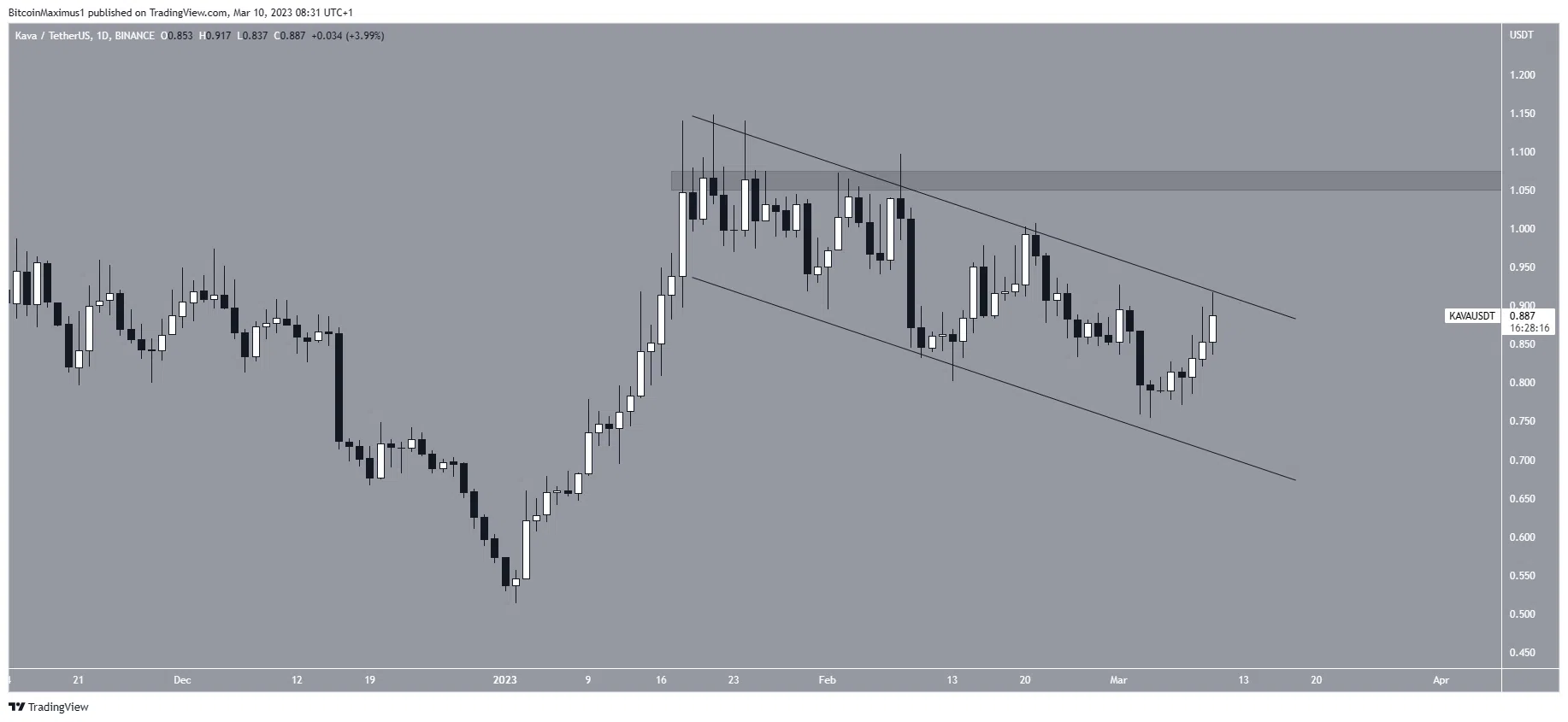 Nếu xảy ra, giá KAVA có thể tăng lên 1,06 USD. Mặt khác, nếu bị từ chối sau đó, KAVA có thể rơi xuống đường hỗ trợ của kênh ở mức 0,7 USD.