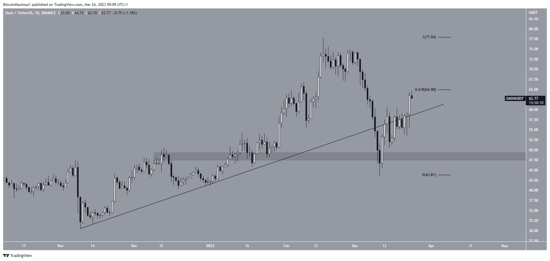Giá Dash (DASH) đã bật lên ở vùng hỗ trợ 48 USD vào ngày 14 tháng 3, bắt đầu xu hướng tăng hiện tại. Nó đã lấy lại một đường hỗ trợ tăng dần vào ngày 23 tháng 3.