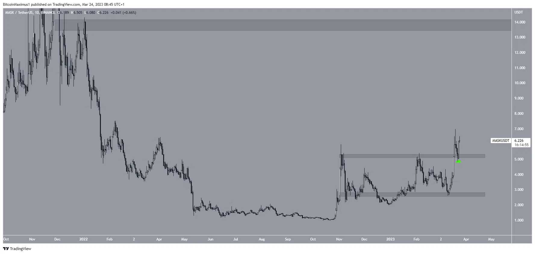 Giá MASK đã tăng mạnh kể từ tháng 11 năm 2022. Trong khi đà tăng bị đình trệ dưới vùng kháng cự 5,95 USD, giá cuối cùng đã thoát ra khỏi vùng này. Nó hiện đang trong quá trình xác nhận nó là kháng cự. Nếu mức tăng tiếp tục, vùng kháng cự gần nhất tiếp theo sẽ là 13,80 USD.