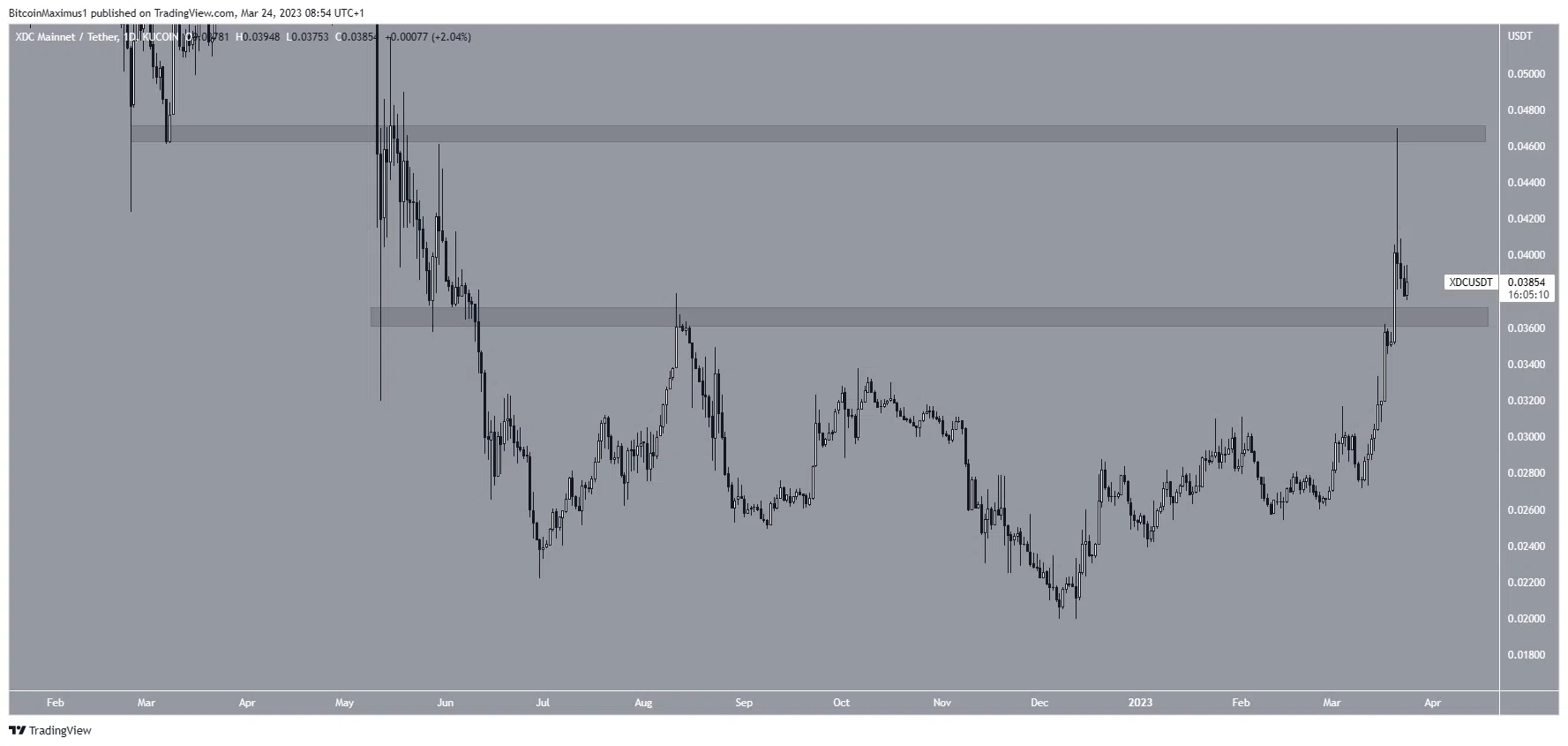 Giá XDC đã tăng kể từ đầu năm, tạo ra mức thấp cao hơn trong tháng Ba. Điều này đã gây ra sự bứt phá khỏi vùng kháng cự 0,036 USD và mức cao mới hàng năm là 0,047 USD vào ngày 21 tháng 3.