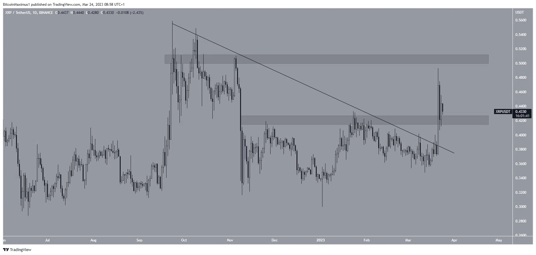 Giá XRP đã bứt phá khỏi đường kháng cự giảm dần vào ngày 21 tháng 3. Giá đạt mức cao mới hàng năm là 0,493 USD trước khi giảm. Sau đó, giá đã xác nhận khu vực 0,430 USD là hỗ trợ trước khi bật lên.