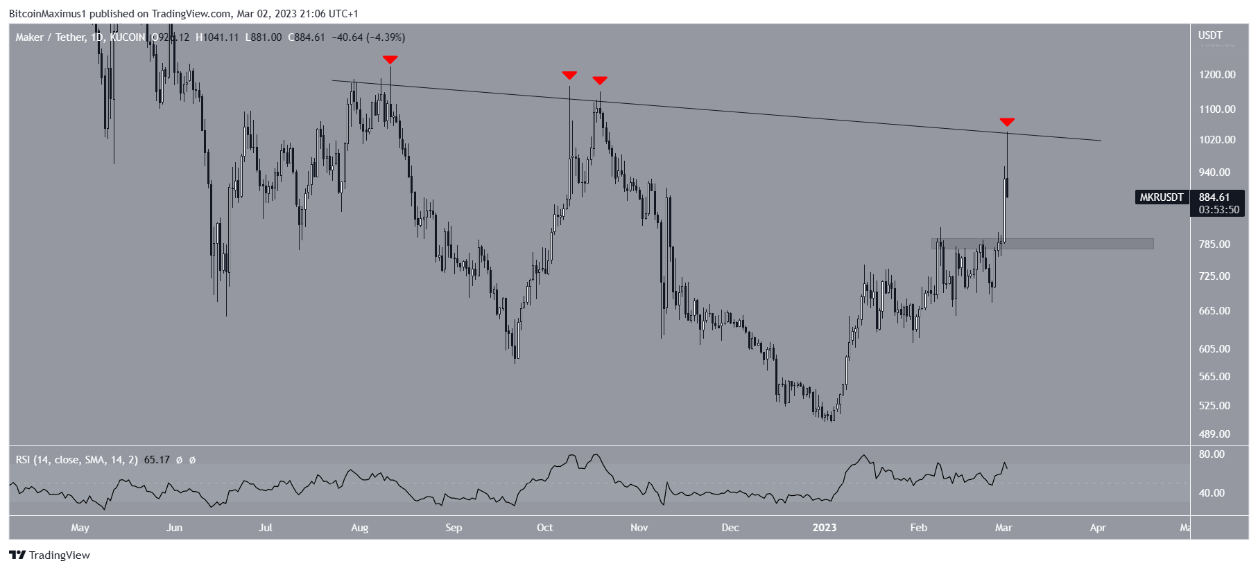 Giá Maker đã giảm xuống dưới đường kháng cự giảm dần kể từ tháng 7 năm 2022. Đường này đã gây ra nhiều lần bị từ chối cho đến nay, lần gần đây nhất là vào ngày 2 tháng 3. Sau đó, tài sản kỹ thuật số đã tạo ra một bấc dài phía trên. Nó đã rơi kể từ đó.