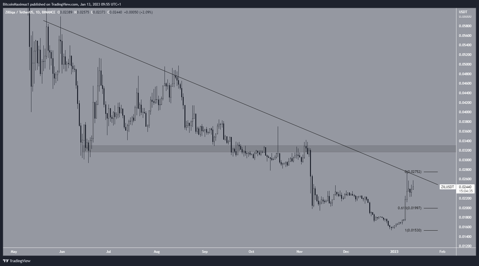Giá ZIL đã tăng kể từ ngày 30/12. Vào ngày 09/1, ZIL đạt mức cao nhất là 0.027 USD. Tuy nhiên, giá ZIL đã không thể vượt qua ngưỡng kháng cự giảm dần kể từ tháng 5. Thay vào đó, nó đã bị từ chối và tạo ra một bóng nến dài phía trên (biểu tượng màu đỏ). Giá ZIL đang thực hiện một nỗ lực khác để thoát ra khỏi đường này.