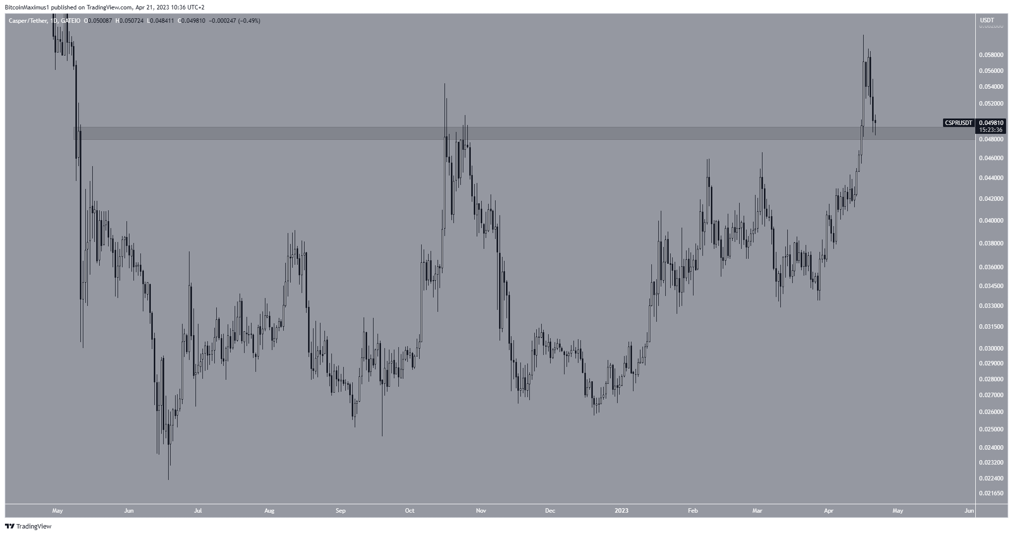Tương tự như RNDR, giá CSPR đã giảm kể từ khi đạt mức cao mới hàng năm là 0,060 USD vào ngày 16 tháng 4. Hiện tại, giá giao dịch bên trong vùng hỗ trợ ngang 0,049 USD.