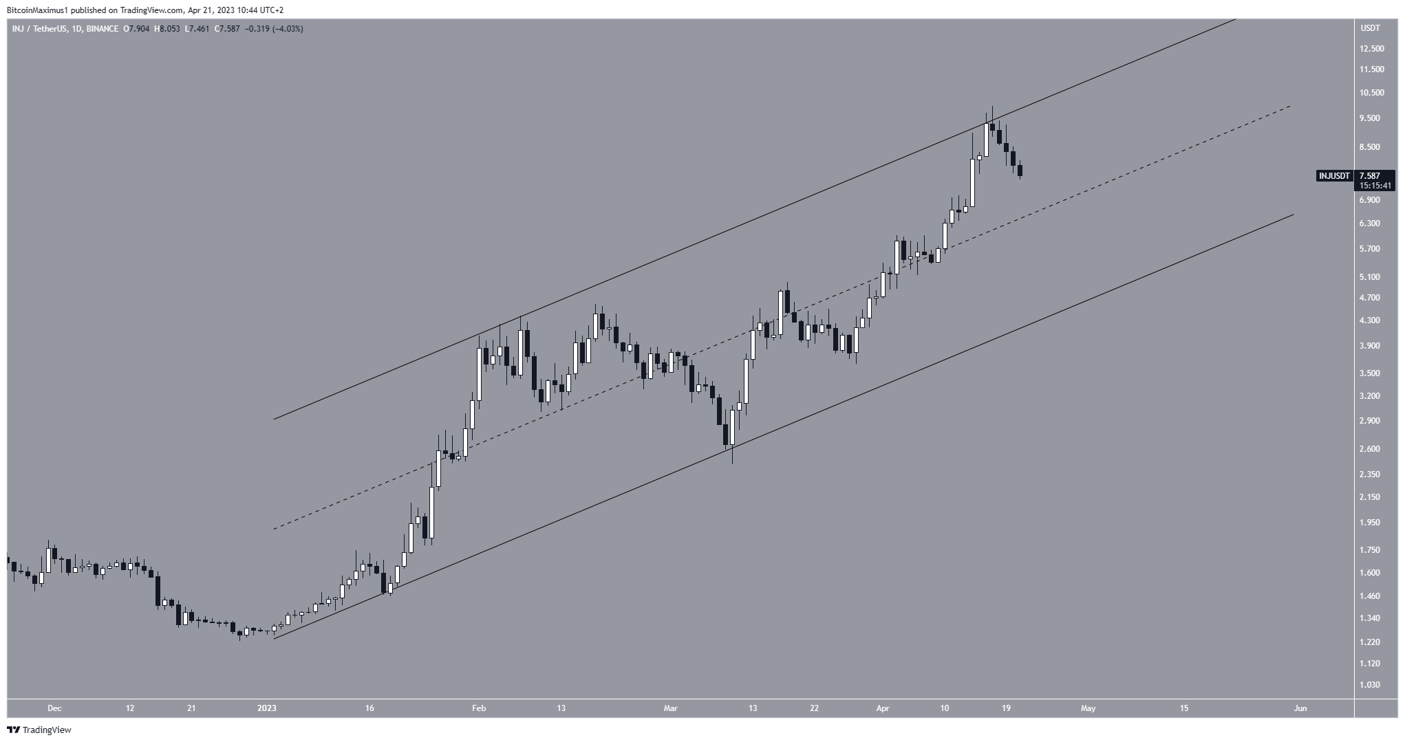 Giá INJ đã ở trong một xu hướng tăng kể từ đầu năm. Trong thời gian này, nó đã tăng lên bên trong một kênh song song tăng dần.