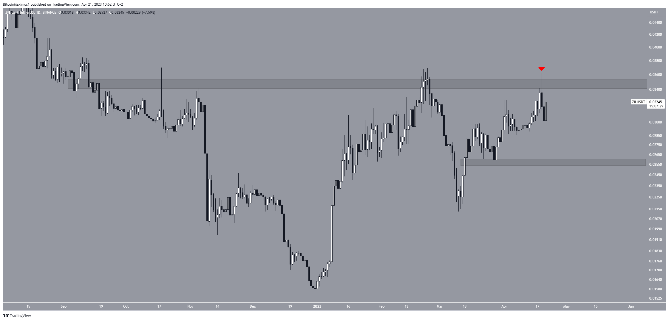 Giá ZIL đã giảm kể từ khi bị từ chối bởi vùng kháng cự ngang 0,035 USD vào ngày 19 tháng 4 (biểu tượng màu đỏ). Khu vực này rất quan trọng vì trước đây nó đã đóng vai trò là vùng kháng cự kể từ tháng 9 năm 2022.