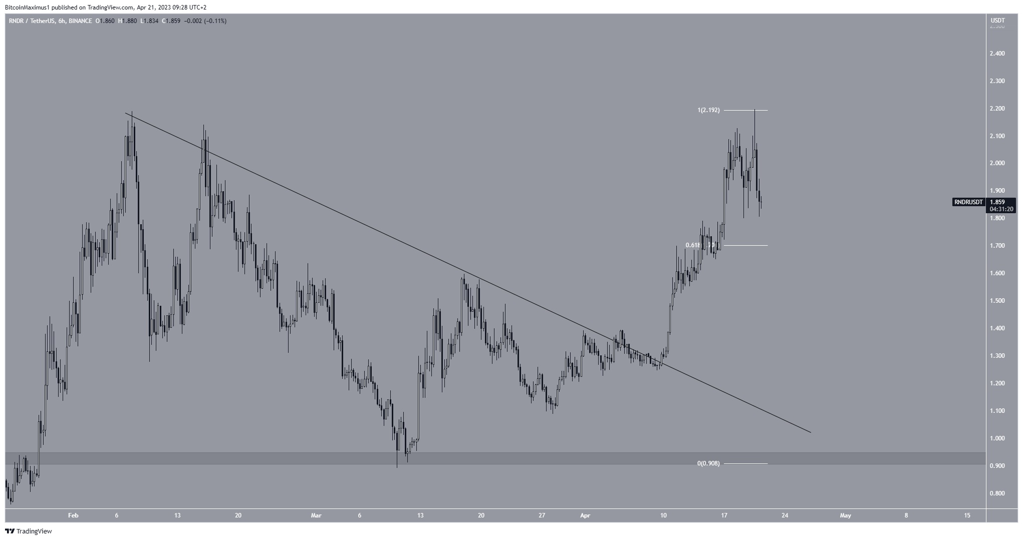 Giá RNDR đã giảm kể từ khi đạt mức cao nhất hàng năm là 2,19 USD vào ngày 20 tháng 4. Cùng ngày, nó đã tạo ra một bấc dài phía trên. Những cái bấc như vậy được coi là dấu hiệu của áp lực bán vì điều đó có nghĩa là người mua không thể duy trì giá. Thay vào đó, những người bán tiếp quản và đẩy nó xuống, tạo thành cái bấc.