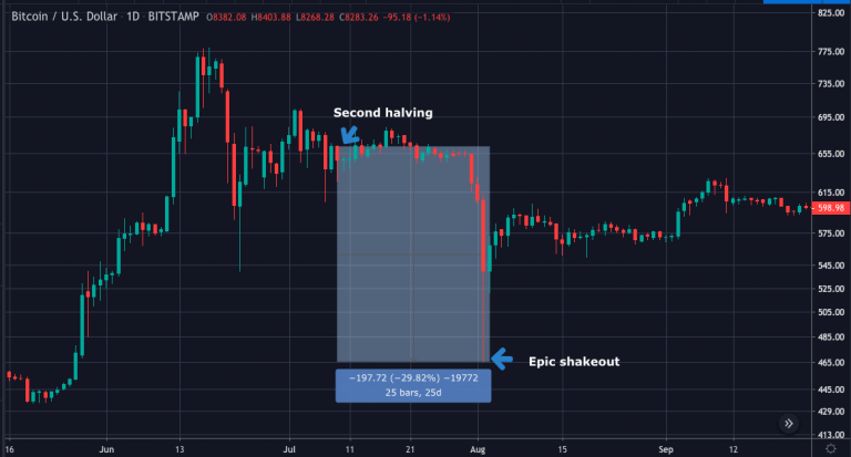 Kịch bản tương tự chính xác đã xảy ra chưa đầy một tháng sau khi giảm một nửa. Tiền điện tử chiếm ưu thế đã mở ở mức $663 vào ngày giảm một nửa thứ hai. Đến ngày 2 tháng 8 năm 2016, nó đã được ghi nhận là $465,28. Đó là sự mất giá 29,8%.