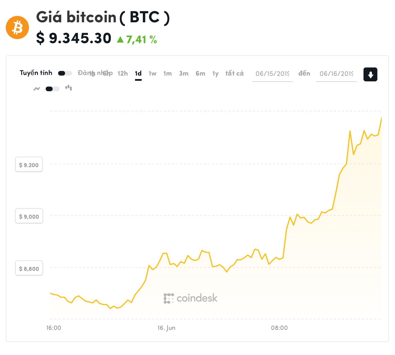 Tiền điện tử hàng đầu theo vốn hóa thị trường đã tăng lên 9.381 đô la lúc 05:55 UTC – mức giá cao nhất kể từ ngày 10 tháng 5 năm 2018, theo Chỉ số giá Bitcoin của CoinDesk.