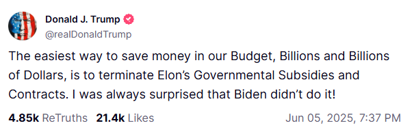 Nhìn chung, cuộc tranh cãi công khai này đã nhanh chóng vượt khỏi tầm kiểm soát, với Musk gián tiếp cáo buộc Tổng thống về tội ấu dâm. Như nhiều người đã chỉ ra, đây không phải là lần đầu tiên mối quan hệ kinh doanh của họ xuống dốc.