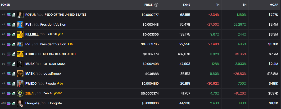 Hầu hết các meme coin đang thịnh hành trên Solana DEX hiện nay đều xoay quanh Trump và Elon Musk. Một số token này thậm chí đã đạt gần 7 triệu USD vốn hóa thị trường hôm nay.