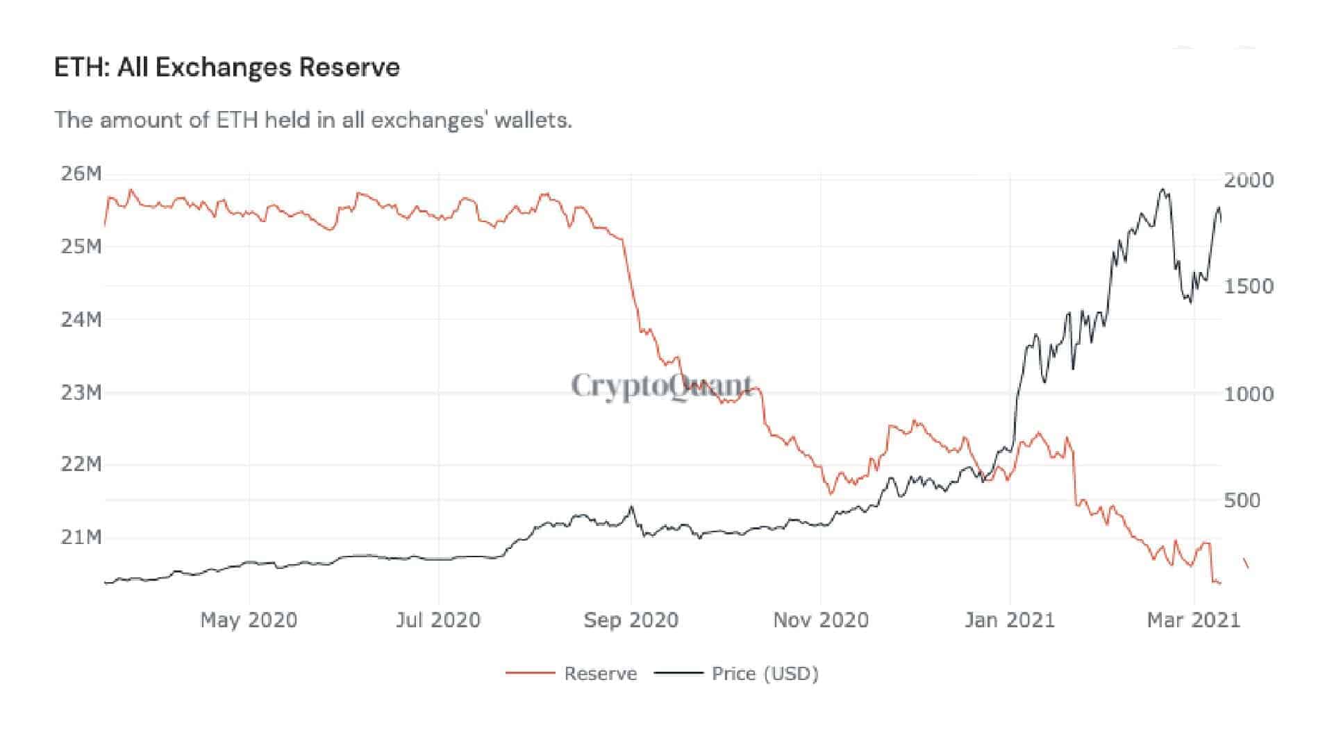Dữ liệu được cung cấp bởi công ty phân tích CryptoQuant thông báo rằng số lượng token Ether được giữ trên các sàn giao dịch tập trung đã giảm dần kể từ quý cuối cùng của năm 2020. Vào thời điểm đó, các nhà đầu tư đã lưu trữ một phần tương đối ổn định khoảng 26 triệu đồng tiền trong vài tháng liên tiếp.