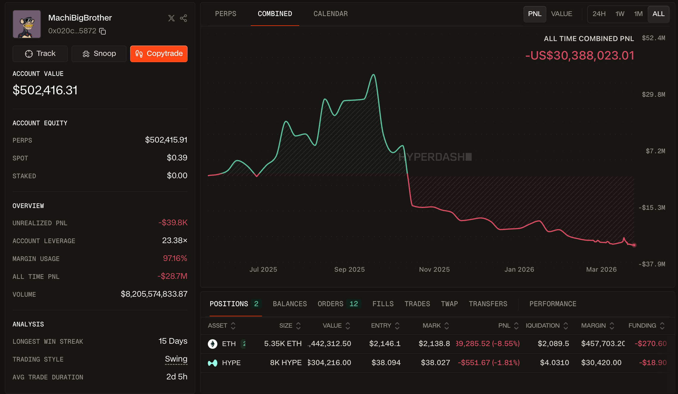 Machi Big Brother went from being up $44.84M to losing EVERYTHING. He is down a total of $75.19 MILLION in the past 6 months.
