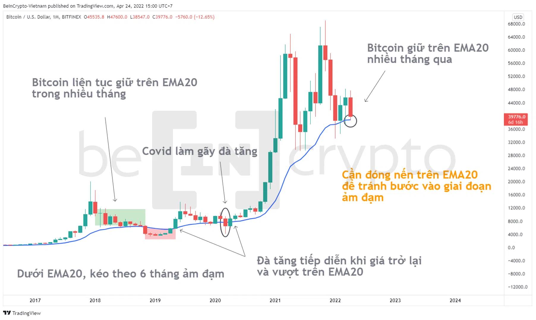 Mức giá tương ứng EMA20 của Bitcoin trong khung tháng là vùng 38,700 USD. Đường trung bình động này đóng vai trò thế nào trong sự tăng trưởng giá Bitcoin, mời bạn tham khảo qua bài viết sau.