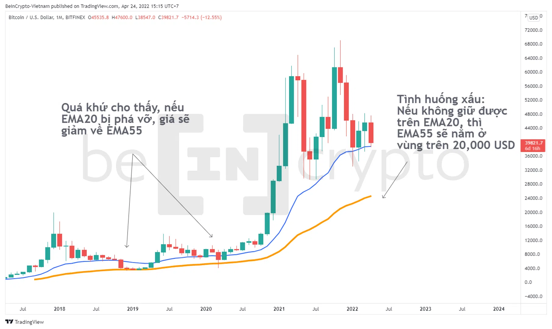 - Quý1/2022, giá Bitcoin dù điều chỉnh sâu vẫn rút râu nến tháng và đóng nến trên EMA20. Hiện nay, giá đã trở lại vùng này như là một hỗ trợ tốt và cuối cùng.