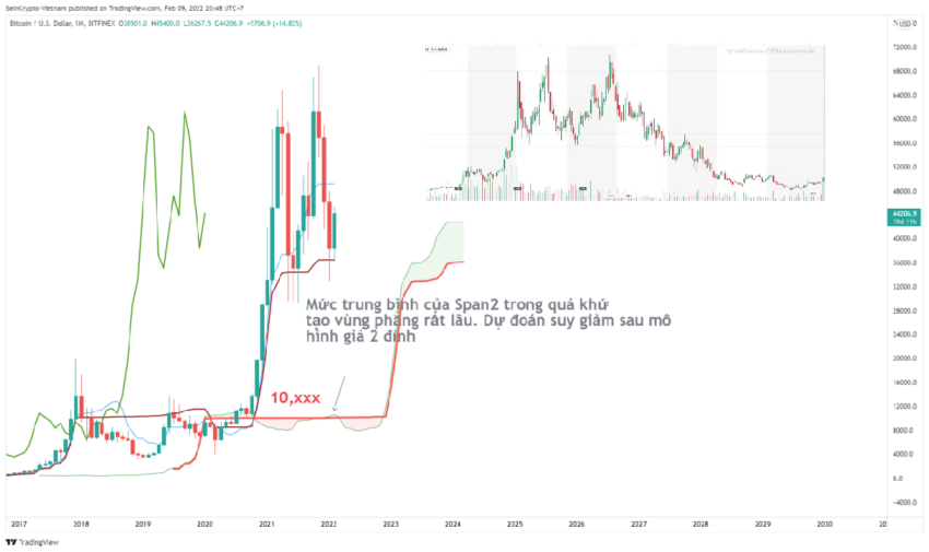 Nếu quan sát biến động Bitcoin bằng chỉ báo Ichimoku, sẽ nhận thấy vùng span2 của khung tháng là vùng trung bình lớn của sự tăng trưởng từ 2017 cho đến 2020.