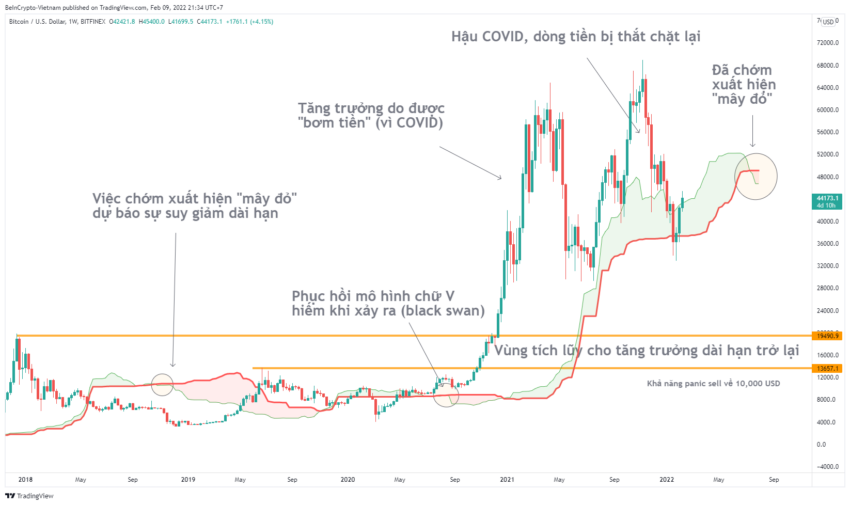 Kết hợp với phân tích kỹ thuật theo Ichimoku, có 3 lần trong lịch sử khung 1W xuất hiện mây đỏ. (lưu ý mây bị đẩy về phía trước nên nó đi trước giá). Lần thứ nhất đã dự báo sự suy giảm BTC từ 6,000 USD về gần 3,000 USD. Lần thứ 2 mây kumo nhanh chóng bị xóa nhòa nhờ có sự phục hồi V-shape. Nhưng lần thứ 3 này liệu sẽ thêm một V-shape nữa để lấy lại đà tăng?