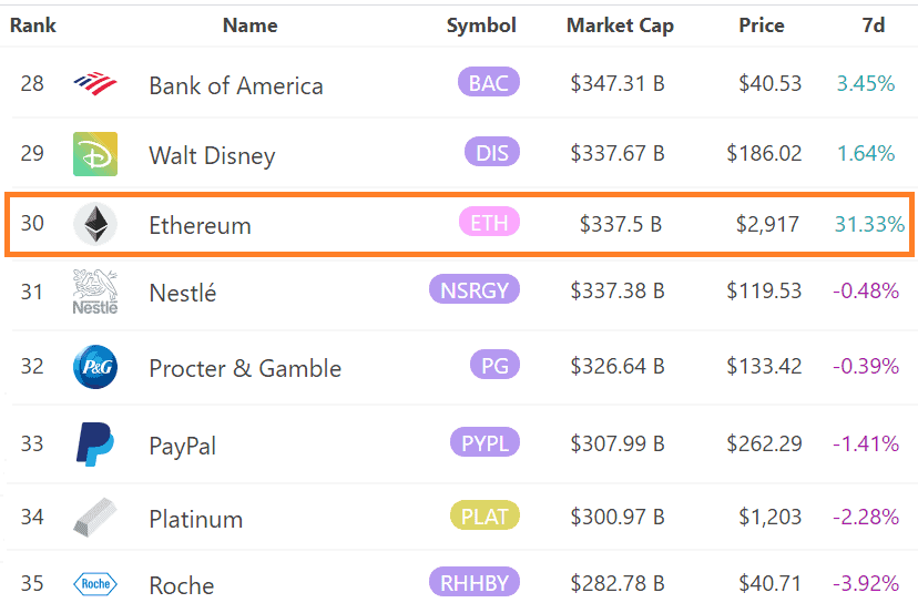 Theo dữ liệu từ Infinite Market Cap, Ether gần đây đã vượt qua mức vốn hóa thị trường của Nestle, Procter & Gamble, PayPal và Roche.