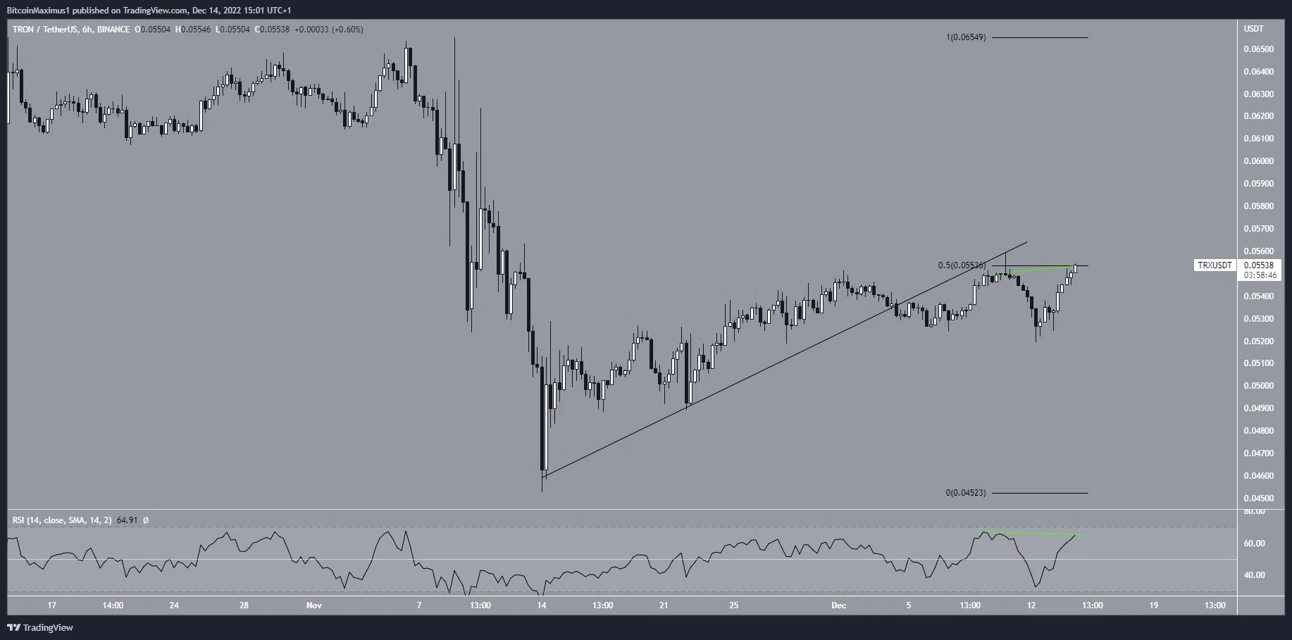 Biểu đồ 6 giờ cũng cho các tín hiệu tương tự như khung thời gian tuần. Nó cho thấy rằng giá TRX đã phá vỡ đường hỗ trợ tăng dần và xác nhận nó là mức kháng cự. Ngoài ra, nó cho thấy vùng kháng cự 0.055 cũng là mức kháng cự thoái lui Fib 0.5 của lần giảm gần đây nhất, càng củng cố tính hợp lệ của nó.