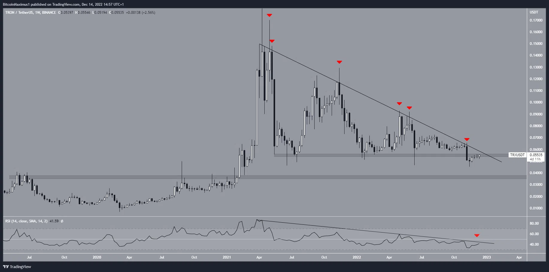 Phân tích kỹ thuật từ khung thời gian tuần cho thấy xu hướng giá Tron là giảm. Theo đó, giá TRX đã giảm xuống dưới đường kháng cự giảm dần, hình thành kể từ tháng 4/2021. Cho đến nay, giá TRX đã bị từ chối 6 lần tại đường này (biểu tượng màu đỏ). Lần gần đây nhất là vào ngày 07/11, khiến giá rơi khỏi khu vực hỗ trợ 0.055 USD. Đây là một sự phát triển quan trọng trong hành động giá Tron vì khu vực này đã đóng vai trò hỗ trợ kể từ tháng 3/2021.